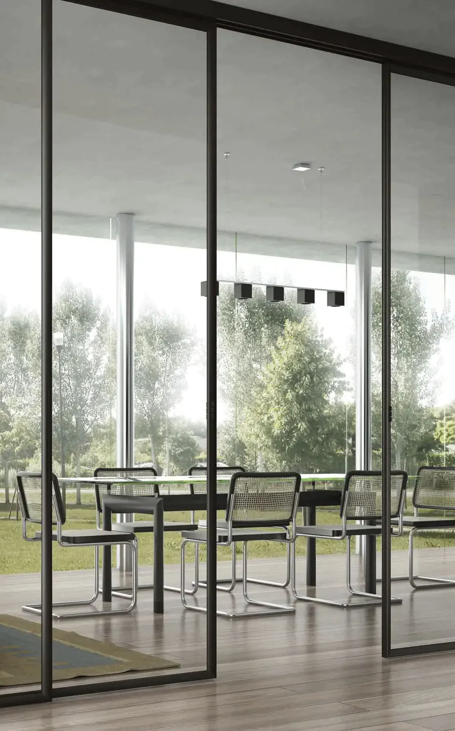 Creating rooms within rooms with glass walls can evoke a more spacious feel while maintaining a private atmosphere. It also allows light to enter while providing excellent visuals.